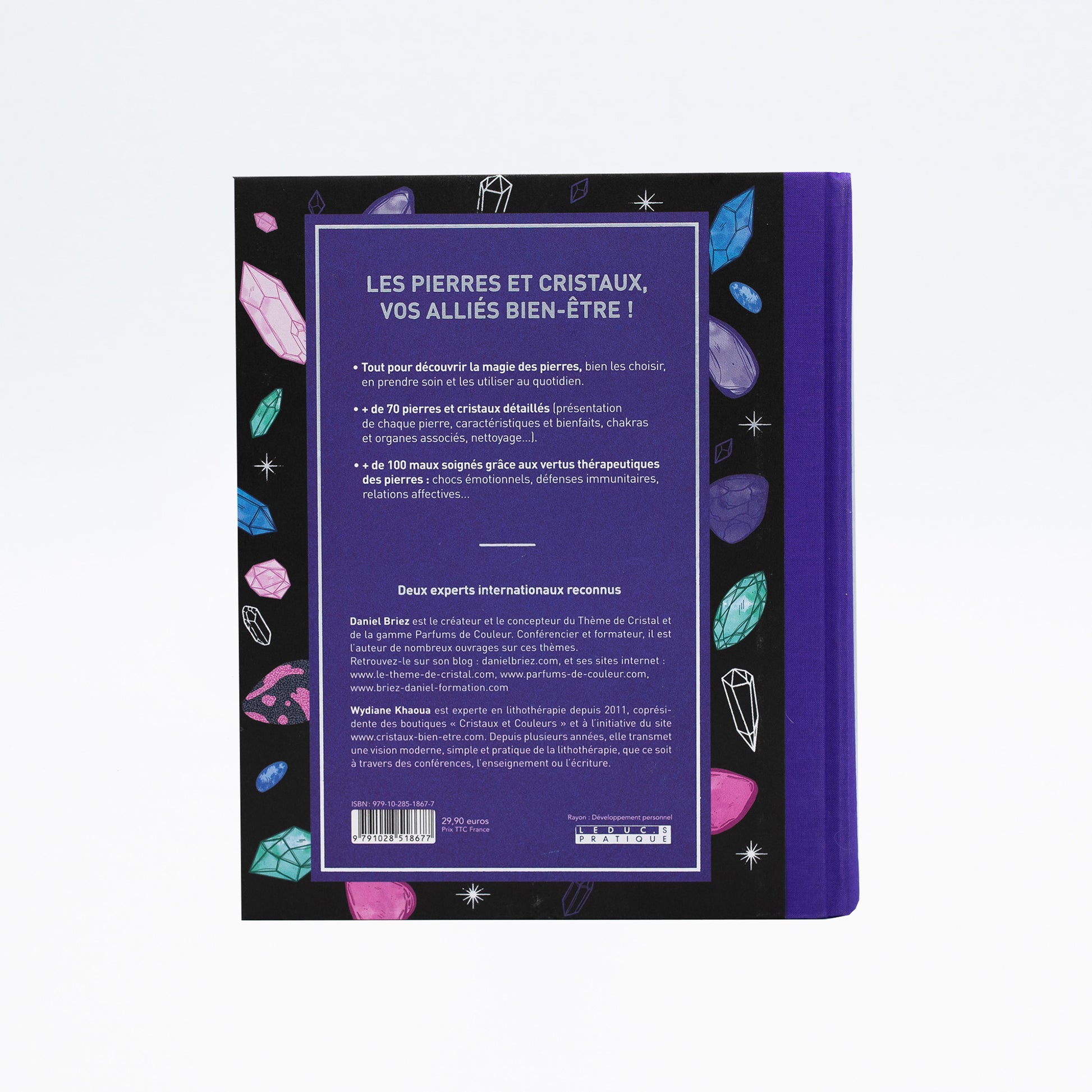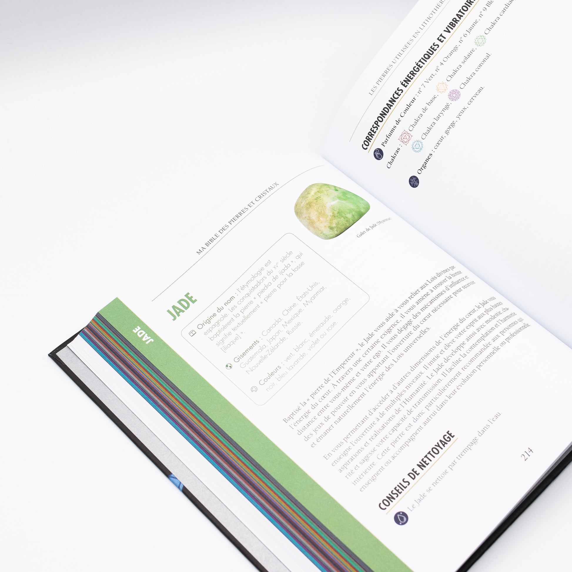 - + de 70 pierres et cristaux détaillés (présentation de chaque pierre, caractéristiques et bienfaits, chakras et organes associés, nettoyage…).